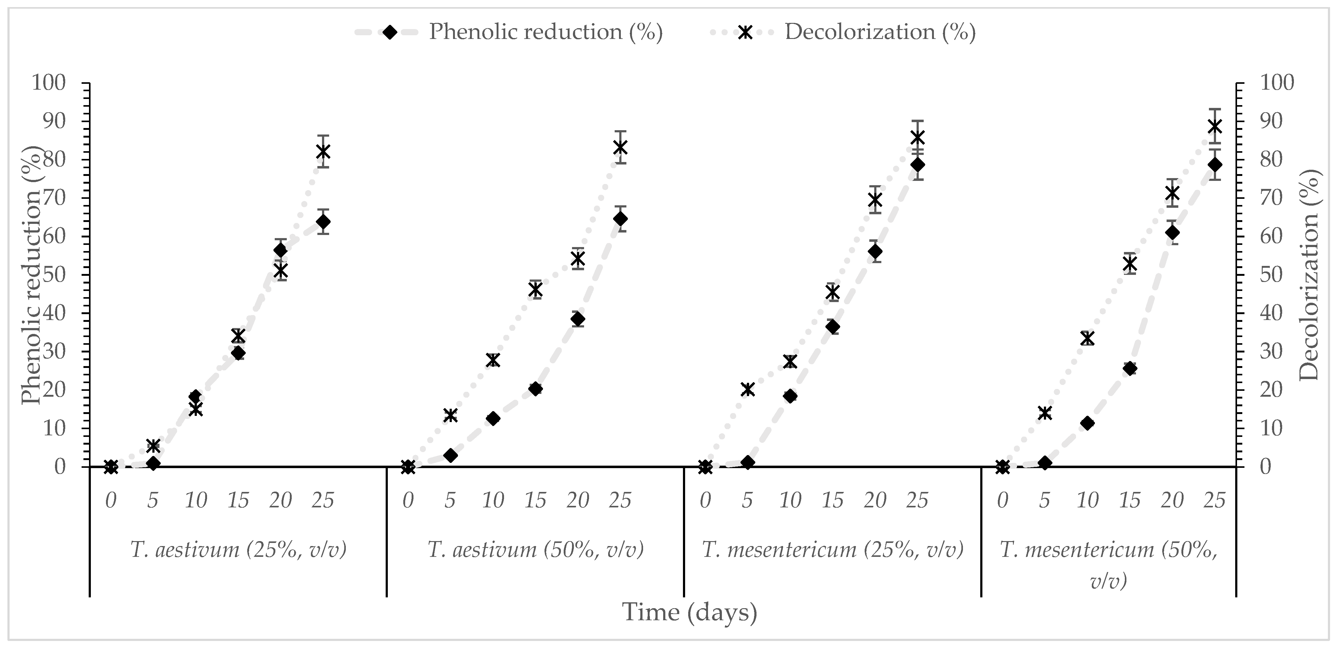 3.3. Fungal Efficiency in Phenolics Compounds Removal and Decolorization