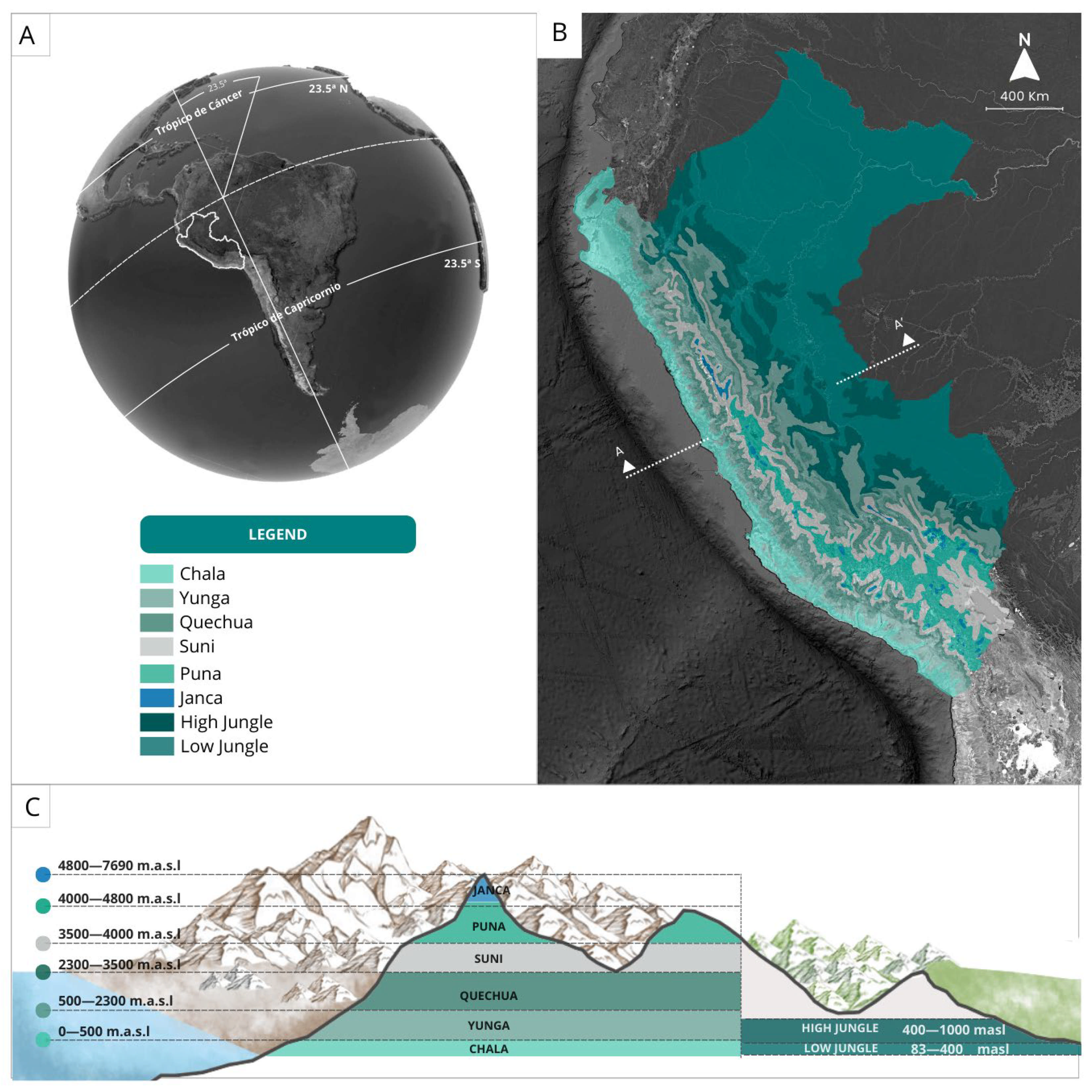 - Pulgar Vidal, J. Geografía del Perú: Las Ocho Regiones Naturales. La Regionalización Transversal. La Sabiduría Ecológica Tradicional; PEISA: Lima, Peru, 1996; Available online: https://catalogobiblioteca.ingemmet.gob.pe/bib/14476 (accessed on 25 April 2024).