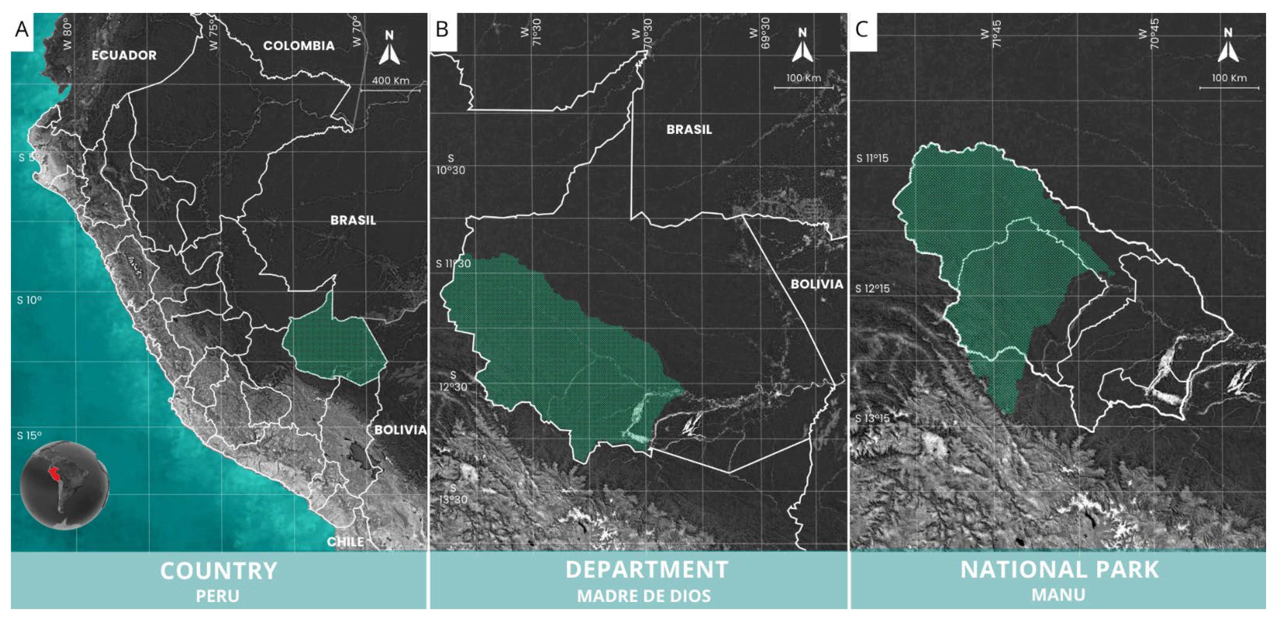 - Servicio Nacional de Áreas Naturales Protegidas por el Estado (SERNANP). Parque Nacional del Manu. Available online: https://www.gob.pe/institucion/sernanp/informes-publicaciones/1948163-parque-nacional-del-manu (accessed on 25 April 2024).