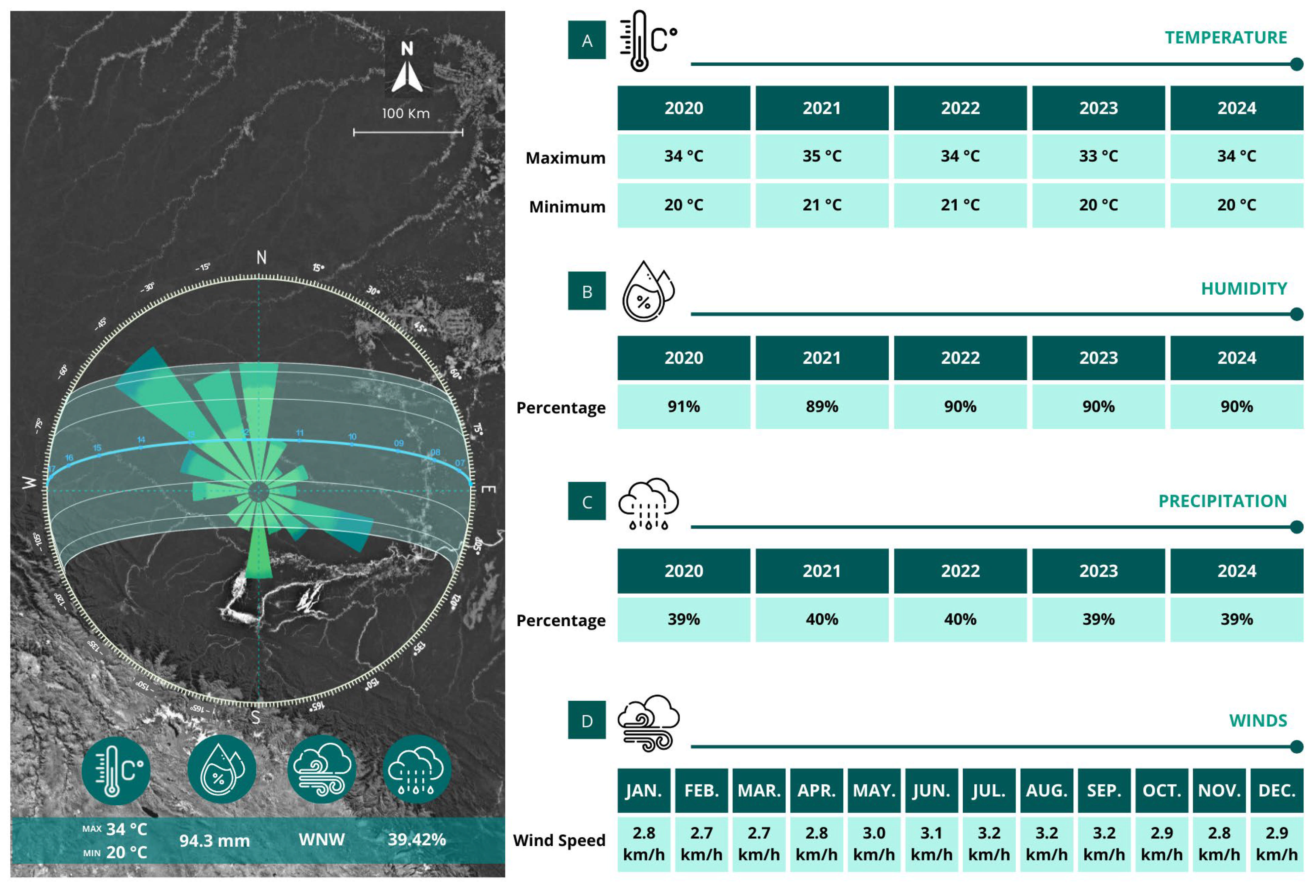 - MeteoBlue 2024 weather data collection for the year 2024, both wind (km/h) and precipitation;
