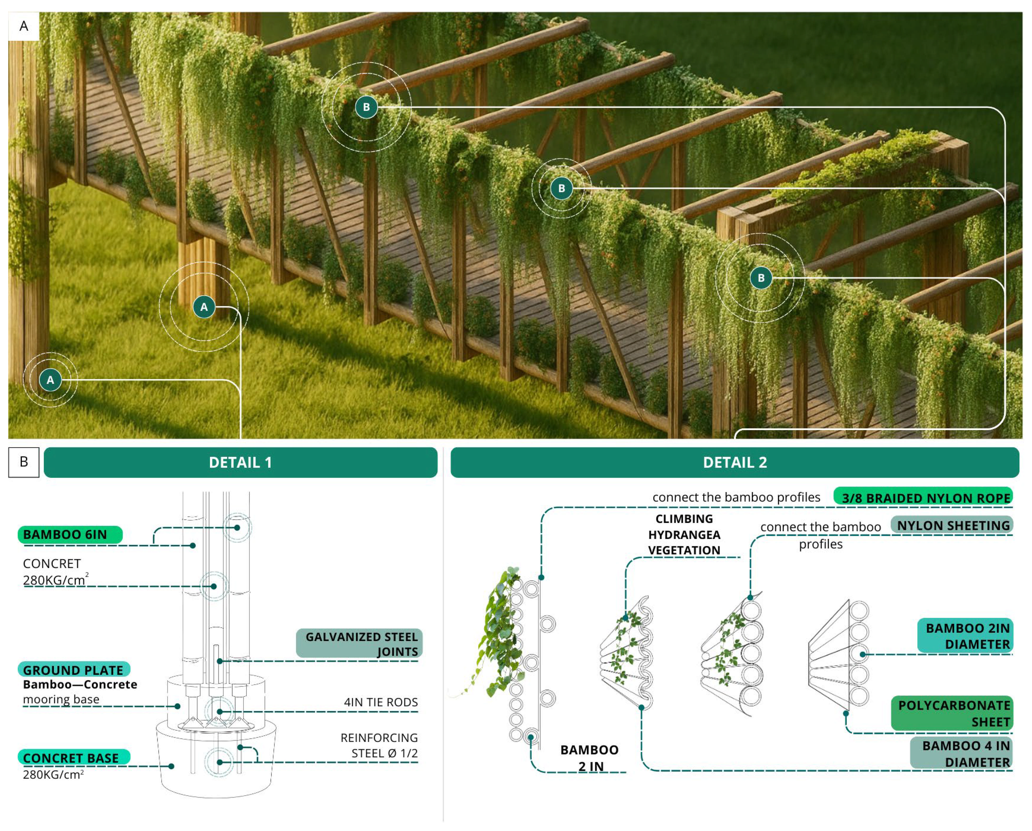 3.5.2. Green Wall System with Bamboo Structures