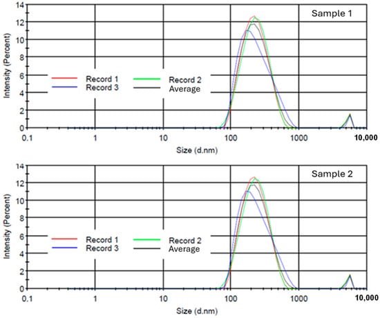 Similar average particle diameter values were obtained for the two samples (230.8 nm and 222.0 nm) with a polydispersity index of 0.282 in both cases. The PdI is a parameter used to measure the uniformity of the size of a nanoparticle sample. The value of PdI ranges from 0 (perfectly uniform size distribution) to 1 (highly polydisperse sample) [50,51,52,53,54]. The PdI value obtained in this study indicates a suspension with a fairly uniform particle size distribution. It is widely accepted in the literature that PdI values below 0.2 indicate a uniform particle size distribution. However, for applications such as particle nanocarriers or polymer nanoparticles used in cosmetics, food or pharmaceuticals, values up to 0.3 are considered acceptable for describing a relatively homogeneous particle size distribution, indicating a suspension with a fairly uniform particle size distribution [51,52,53,55].