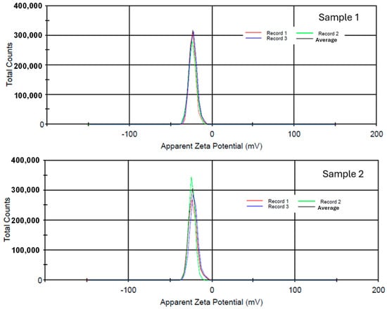 The average zeta potential values obtained were −23.3 mV and −22.8 mV for samples 1 and 2, respectively. These values are close to those recommended for a stable colloidal suspension, demonstrating the system’s stability and low tendency to aggregate [55,56].