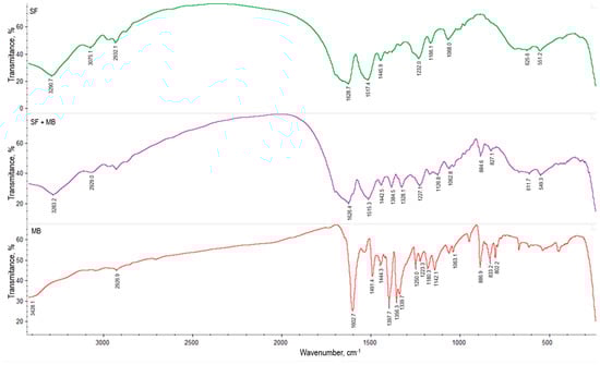 Figure 3 shows the infrared spectrum corresponding to SF before and after MB adsorption, as well as the spectrum corresponding to this dye. The adsorbent material exhibits many absorption bands, which indicates its complex structure. Thus, characteristic bands of water-insoluble crystalline fibroin, or type II silk (β-sheet structure), are visible at 3300 cm−1 (corresponding to O–H and N–H stretching vibrations of hydrogen bonds) [62], 1629 cm−1 corresponding to amide I (C=O stretching), 1517 cm−1 associated to amide II (N–H blending), and 1232 cm−1 attributed to amide III (C–N stretching and N–H deformation) [62,63,64,65,66,67,68]. Additionally, other absorption bands can be observed at 3100 cm−1–2900 cm−1 and at 1445 cm−1 (associated with the C–H bond in alkyl, aliphatic and aromatic groups) and at 1166 cm–1 and 1067 (assigned to C-N vibrations) [69,70].