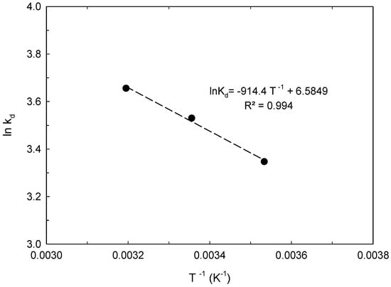 The intraparticle diffusion model is particularly relevant for porous adsorbents, where internal diffusion governs the overall rate of adsorption [5,15,43,44,45]. In the intraparticle diffusion model, kd is the intraparticle diffusion rate constant (mg·g−1·min−1/2) and C (mg·g−1) is a constant related to the thickness of the boundary layer. The C values determined in this work are between 45.9 mg·g−1 and 75.4 mg·g−1, which indicates a film resistance to mass transfer surrounding the adsorbent particle.