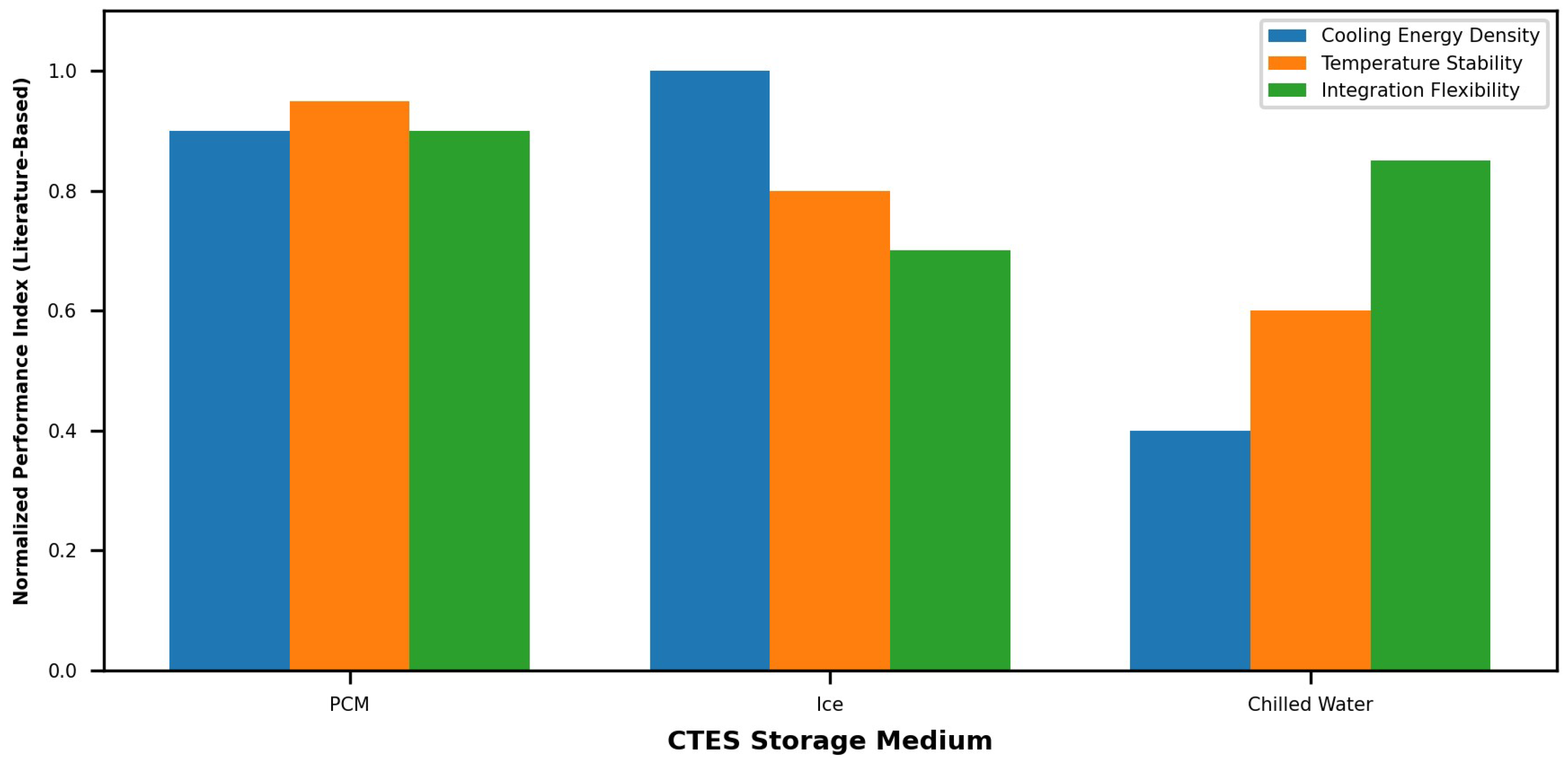 CTES materials for rural postharvest cooling are commonly classified into sensible (chilled water), latent (ice and PCMs), and sorption-based systems. These categories differ in energy density, operating temperature range, system complexity, and suitability for solar-powered cold-chain applications. A qualitative comparison of chilled-water-, ice-, and PCM-based storage in terms of energy density, temperature stability, and system integration flexibility is presented in