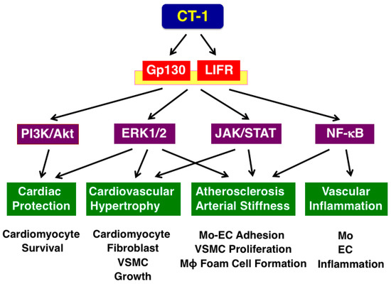 Intracellular signal transduction of cardiotrophin-1 (CT-1) in cardiovascular responses. CT-1 activates the gp130 and LIFR complex, followed by the PI3K/Akt, ERK1/2, JAK/STAT, and NF-κB pathways (Adapted from [42]). The combined pathways induce cardiac protection, cardiovascular hypertrophy, atherosclerosis, arterial stiffness, and vascular inflammation (Adapted from [22]). EC = endothelial cell, ERK = extracellular signal-regulated kinase, JAK = Janus kinase, LIFR = leukemia inhibitory factor receptor, Mo = monocyte, MΦ = macrophage, NF-κB = nuclear factor-κB, PI3K = phosphatidylinositol 3-kinase, STAT = signal transducers and activators of transcription, VSMC = vascular smooth muscle cell.