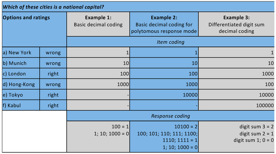 In case that attractors and distractors should be distinguished; however, an answer should be evaluated as wrong if only one of the attractors was selected, a simpler coding method was possible where different sections of attractor and distractor values are not needed. Here, the coding was according to Section 4.1, with the addition that distractors were coded with a value, which was above the digit sum for all attractors chosen at once. For example, if a response sum resulted in five digits, distractors should be coded with values of 6 and above. Then, each digit sum bigger than 5 was defined in the RC as wrong. A response sum of 11601 would display the selection of a distractor in the third place. Accordingly, the digit sum is 9, and therefore, in the quantity of wrong solutions. This method is also useful to impose sanctions on selected distractors, which are especially sensible.