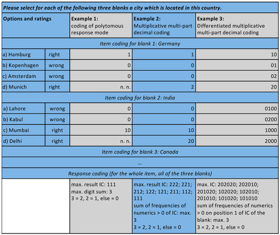 Furthermore, a factor was introduced to divide between different attractors and distractors in each gap. This means that each response options got an increasing factor with individual values. Consequently, when, for example, three attractors were among the possible options of a gap, they could be coded with the factor 1 to 3 and multiplied with the specific decimal power of the gap. An example for this was shown in the second example of Figure 2. In the first gap the correct solutions Hamburg und Munich are coded increasingly with the values 1 (= 1 × 100) and 2 (= 2 × 100). In a possible second gap, for example asking for cities in India, the cities of Mumbai and Delhi would be analogous coded with the values 10 and 20 (= 1 × 101 and 2 × 101). A possible third gap for Canada would be coded with values 100, 200 and so forth. The response sum 012 displays, in this example, that in the first gap the second correct answer (= Munich) was chosen, in the second gap the first correct answer (= Mumbai) was chosen and in the third gap a distractor was chosen.