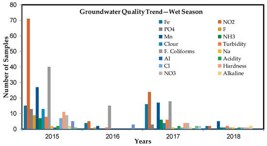 Groundwater quality variations during wet season from 2015 to 2018 (number of nonqualifying parameters, n = 19).