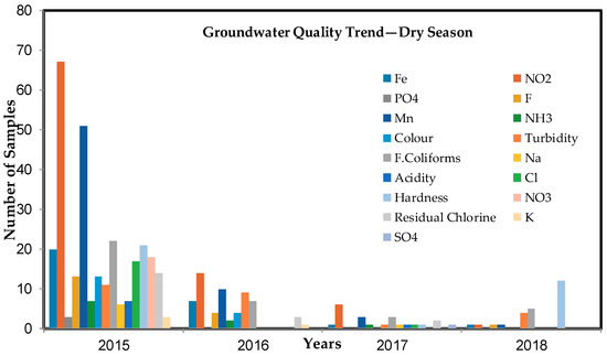 Groundwater quality variations during dry season from 2015 to 2018 (number of nonqualifying parameters, n = 17).