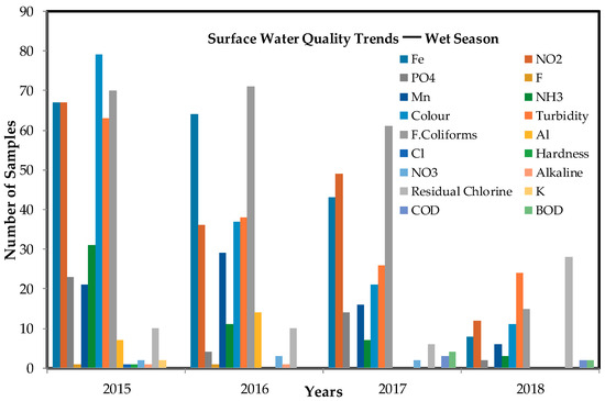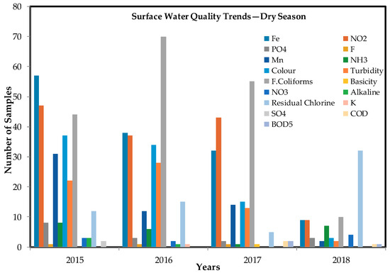In all water quality trend plots (Figure 3, Figure 4, Figure 5 and Figure 6), groundwater is observed to have a lesser number of samples and, hence, a low number of nonqualifying parameters compared to surface waters. Limited groundwater samples are attributed to privately owned boreholes that are negligibly tested for water quality; the few groundwater sources noted are due to regulatory requirement assessments over several private companies that usually require compliance confirmation to their accrediting organizations. Parameters noted to exceed in groundwater sources were mostly the same for surface water sources, although several unique parameters existed for each source. While the wet season was observed to have a dilution effect on groundwater sources by presenting less nonqualifying parameters, as contrasted by their dry season statistics, surface water sources are characterized by high nonqualifying parameters during the wet season due to interaction with mostly terrestrial rain surface run-off. Useful information obtainable from these plots includes:
