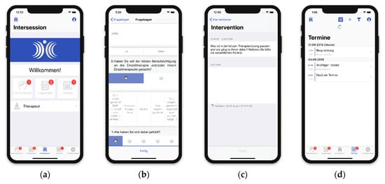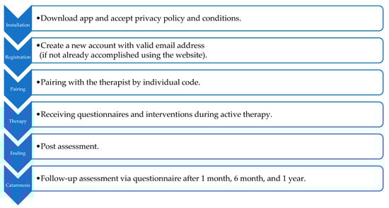 Over the last decade, mobile health technologies have become more and more important in medicine and especially in psychotherapy [1] and have been termed as mobile health or short mHealth [2]. mHealth, as defined by the World Health Organization [3], is “[…] medical and public health practice supported by mobile devices, such as mobile phones, patient monitoring devices, personal digital assistants (PDAs), and other wireless devices.” mHealth creates the possibility to offer support and interventions in real time [4] and implicates several benefits—both for the patient and the therapist [5]. Advantages of mHealth are among others: overcome barriers associated with waiting-time, mobility, or costs. Furthermore, the use of mHealth is connected to less stigma and more privacy and can be used every time and everywhere like in stressful situations as a therapist in the pocket [6,7]. It is also an easy way for the patient to communicate with the therapist and can be used for patient monitoring and to give access to relevant information for the psychotherapeutic process (i.e., psychoeducation). In a systematic review, Lui et al. (2017) [1] showed that most of the evidence-based apps for psychotherapy are designed as a therapeutic alternative to face-to-face therapy. Main features are symptom monitoring, therapeutic skills, self-management [1], and data collection [8]. Mobile devices can be used for the ambulatory assessment of self-reported data (i.e., symptom distress), performance data (i.e., cognitive skills), phone-based senor data (i.e., physical activity), and wearable sensor data (i.e., sleep behavior) [8]. This form of data collection is particularly suitable where traditional questionnaire surveys reach their limits due to different forms of bias. One of these is the so-called recall bias—an error in answer accuracy regarding experiences from the past [9]. By using mobile devices for ambulatory assessment, it is possible to collect data in real time without a recall bias [10]. This is a huge advantage for data assessment, especially for collecting data between sessions of psychotherapy. These processes are called intersession experiences [11,12] of psychotherapy.
