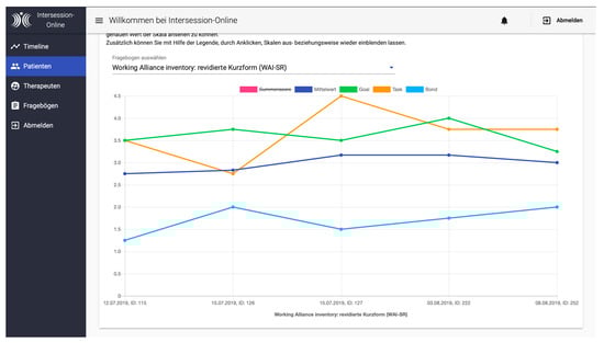 In summary, therapists invest about 60 to 90 min (one time) to get to know and handle Intersession-Online competently as well as 20 to 25 min to introduce patients to the app. Based on previous experiences and pre-tests, the daily usage time per patient is estimated to be about one to two minutes. Within this time, all summarized and graphically presented results of the patient can be viewed, i.e., before a session. The psychotherapeutic practice is characterized by a tight schedule. Therefore, it is necessary to have a simple and clear app structure and user-friendly presented graphical results in order to allow app usage between two sessions.