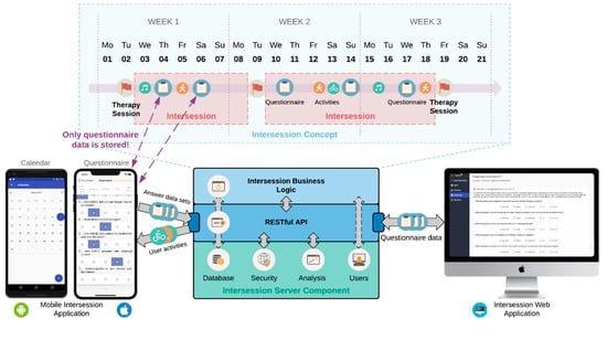 Mobile health devices have become more and more important in psychotherapy. The market is flooded by all kinds of apps and online interventions and today’s technical options open new possibilities, especially for unconventional topics. Interestingly, currently less research on digital solutions exists. For example, recent works [53,54,55] have proposed a framework for remote therapeutic interventions. However, they do not explicitly consider the intersession phase in relation to therapeutic sessions. Since these works stem from the same authors, it is indicated that a digital and mobile-driven intersession management is still in its infancy. However, intersession experiences are a promising topic in psychotherapy research and practice. Nocross and Lambert [56] summarized that about 40% of variances of therapeutic variables are unexplained. Intersession experiences could be an auspicious approach to explain a part of these 40% unexplained variances. Hitherto, there is no possibility to assess intersession experiences in a systematic and economic way. The gold standard for the assessment of intersession experiences is too long for regular assessments. Furthermore, the questionnaire should be filled out immediately before a therapy session, which, in turn, leads to time difficulties and is associated with a recall bias. Here, new technologies could remedy this situation. Intersession-Online, a smartphone-based framework, addresses these problems and offers an opportunity to assess intersession experiences systematically and economically as well as to provide the summarized results to researchers and therapists in a comprehensive way. Moreover, it is planned that the framework is being used as an intervention to promote positive intersession experiences.