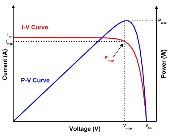 Information related to an open-circuit voltage (), short-circuit current () and maximum power point (, ) at standard test conditions (STC) is typically specified by MSX60 PV producers [22,27].