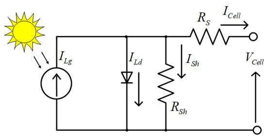 where, is the light-generated current in the cell, is loss diode-current and is the shunt-leakage current. In a single diode module, modeled using the Shockley equation for an ideal diode.
