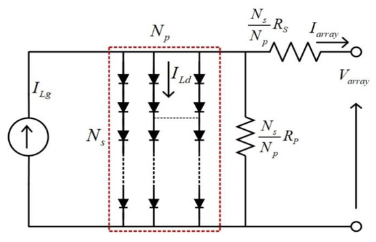 A cluster of multiple PV modules with in-series electrical linking and parallel circuits for producing the necessary current and voltage constitutes a PV array. Figure 4 presents the equivalent circuit associated with the PV module with NP parallel and NS series configuration [24].