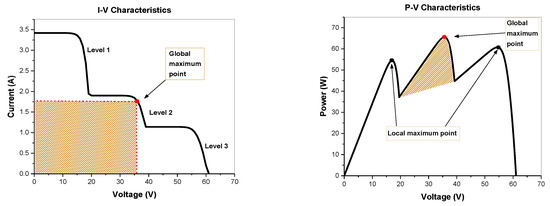 Due to the non-uniform aging conditions, multiple PV power output steps and peaks observed in Figure 7 divides the PV array operation into three different operational levels, where each peak relates to a particular level. Level 1 indicates a phase where module 1 is active, while the currents across modules 2 and 3 are being bypassed through the diodes. At level 1, the current ranges between 0 A and 3.45 A, and the corresponding voltage is 0–22 V. Similarly, level 2 corresponds to the phase where module 1 and module 2 are active, while module 3 is being bypassed.
