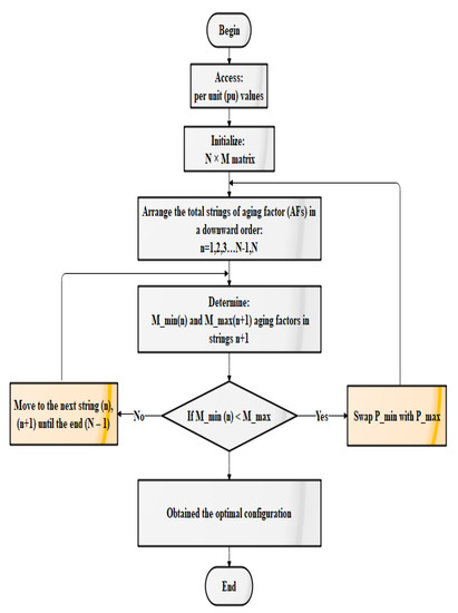 Figure 10 illustrates the flowchart associated N × M with the rearrangement algorithm for the PV array. The suggested algorithm geared towards mitigating the impact of mismatch losses between the PV modules in a given string by relocating separate PV modules in every string according to their AFs. Due to the direct correlation between aging and the short-circuit current, AFs are the only short-circuit current data needed by the algorithm. To attain the best arrangement, the algorithm run until every criterion is satisfied Figure 10.