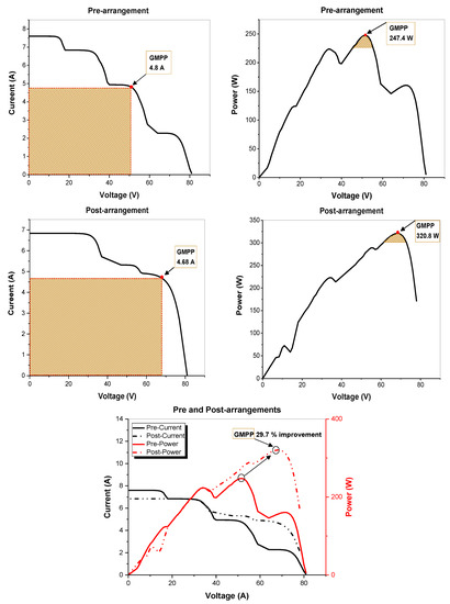 Table 2 shows the PV configuration following a rearrangement using the proposed algorithm. Using the PV array data presented in Table 2, I-V and P-V curves were then plotted as depicted in Figure 11. In Figure 11 highlights that the maximum output power pre-arrangement, is 247.4 W, with a PV array output voltage of 51 V and a GMPP current of 4.8 A, respectively. The maximum output power post-arrangement is 320.8 W, with a PV array output voltage of 68 V and GMPP current of 4.68 A, respectively. It can be seen that the total power output increases by 29.7% as presented in Figure 11 when using the proposed algorithm. The computational time for these rearrangements (as presented in Table 4) for an aged 3 × 4 PV array took 0.02 s.