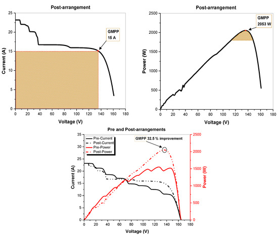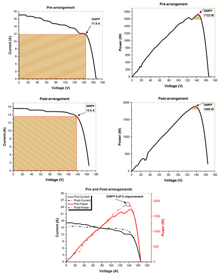 The PV array of dimensions 5 × 8 consisted of five strings and eight modules with in parallel and in-series linking, respectively. For developing a 5 × 8 matrix, simulating non-uniform aging PV array pre-arrangement and determine the best PV structure post-arrangement for this particular case, MATLAB (R2018a) employed for arbitrary production of the AFs in the range 0.9-0.6 pu (Table 5). The ability of the suggested algorithm to yield the ideal arrangement was confirmed by simulating both PV structures. Figure 12 illustrates that the maximum power output pre-arrangement is 1722 W, with a PV array output voltage of 143 V and a GMPP current of 11.9 A, respectively. The maximum power output post-arrangement is 1885 W, with a PV array output voltage of 138 V and a GMPP current of 13.6 A, respectively. The computational time for the proposed algorithm to identify the rearrangements of an aged 8 × 5 PV array (as presented in Table 6) took 0.25 s.