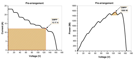 In Table 3, the maximum power and voltage at MPP are set out for all arrangements and the string currents in every case. It is obvious that, from the first to the fifth step, there is a 22.4% rise in the overall output power and the voltage at MPP is greater than the output current. To minimise multiple peaks caused by incompatibility effects (non-uniform aging), the proposed algorithm increases the currents in every string as much as possible through the integration of the PV modules showing similar electrical features.