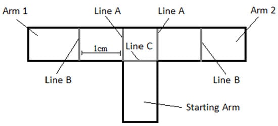 A picture of the t-maze used can be seen in Figure 2. It was made from a rectangular plastic dish filled with paraffin wax, which had a “T”-shaped mould. A schematic of the t-maze is found in Figure 3. A pair of electrodes (one positive and one negative) were placed opposite one another on Line B, in either Arm 1 or Arm 2. The electrodes were separated by about 1 cm and were able to conduct electricity to each other through the spring water.