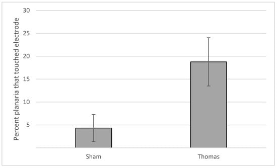 Percent of planaria per day of experiment that made contact with an electrode while in the t-maze. There were 19 days of experiments in the Thomas group and 17 days of experiments in the sham group. Error bars represent standard error of the mean (SEM).
