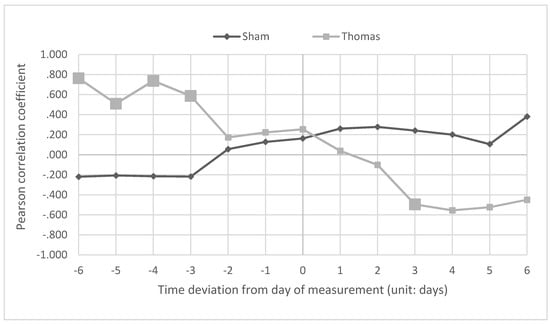 Pearson correlation coefficients of the average daily Ap (planetary geomagnetic index) indices on days before and after the day of experiment, with the standard deviation of the total number of arms each planaria visited while in the t-maze. Extra-large data points in the Thomas condition were significant in Pearson’s and Spearman’s correlation tests and were more than 2 z-scores from their respective point in the Sham group. Ap indices refer to a measurement of fluctuations in the intensity of the geomagnetic field.