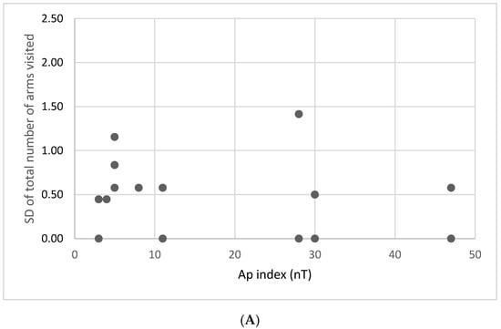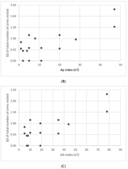The correlation between the standard deviation of the number of arms visited in the Thomas exposure group is evident in the scatterplots (Figure 6). Previous research investigating relationships with the geomagnetic storm indices [20] binned their data into 5 nT increments to investigate threshold effects. While there are not enough data points in this dataset for that type of analysis, it seems worthwhile to visually inspect the scatterplots for any conspicuous thresholds. Comparing Figure 6A,B demonstrates the difference in correlation coefficients shown in Figure 6. Figure 6B indicates that during quiet conditions the daily standard deviation in each condition was in the range of approximately 0–1.40, but started increasing at Ap indices greater than 15 nT. Previous research in this laboratory studying the influence of the geomagnetic field determined threshold values to be 20 nT [20,21,22,23,24,25,26]; however, it is important to note that these studies used the AA indices of geomagnetic deviations. When the AA indices were entered into the current dataset, the potential 15 nT threshold that was found with visual inspection of the scatterplot was found at 20 nT (Figure 6C).