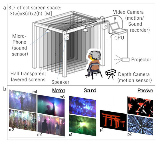 Five university students developed the apparatus hardware including the 3D-effect screen space made by multiple parallel transparent plastic sheets (length 150, width 60, thick 0.03 mm), a Kinect sensor (Xbox360), PC, cameras and microphones (