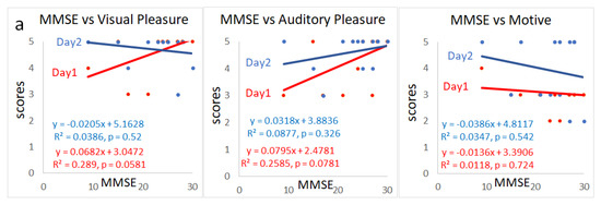 11] to determine their subjective impression of the digital installation; Q1. Visual pleasure: “Was it visually pleasant?”, Q2. Auditory pleasure: “Was it auditorily pleasant?” and Q3. Motive: “Do you currently feel motivated?”. Linear regression was used for correlation analysis between MMSE and sensory pleasure and motivation scores using Excel (Microsoft) and R software.