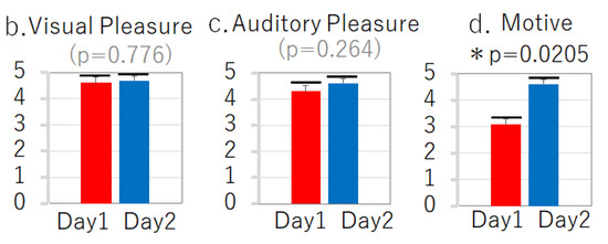 Figure 2b,c). In contrast, the question scores indicated that the participant’s motivation was significantly elevated on Day 2 compared to Day 1 (