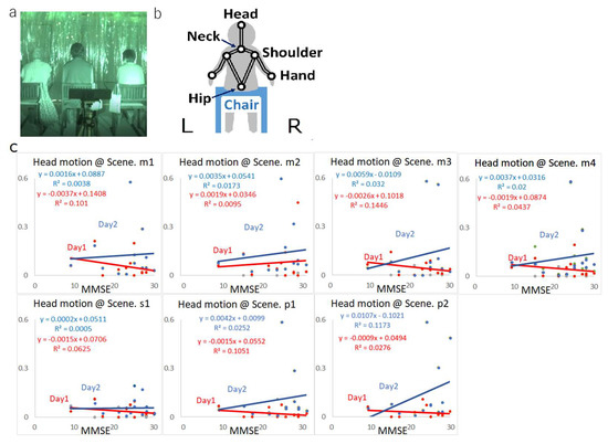 Participant reactions during each of the seven scenes were recorded by video camera (Sony Handycam) without utilizing any wearable sensors to avoid causing any stress to the participants. To analyze each subjects’ representative motion per scene, observers manually focused on the most active fifteen seconds during the scene and obtained the video coordinates of the seven body joints per second by visual identification. This manual tracking method was considered appropriate given that in qualitative pre-observation of the overall video data, each scene was found to have uniform function over the duration. We first checked the validity of the motion data automatically acquired by the Kinect sensors against the data acquired manually. We found that the sitting elderly people move much less than other generation’s, one causing multiple acquisition failures by the Kinect sensors compared to the much more precise manually acquired data. Consequently, we adopted the manual method. To validate the reproducibility of the manual tracking over all the observers, we undertook preliminarily training with the same video data and feedback for each observer’s own difference, to acquire the same coordinate as well as time. The video data were converted into jpeg files and coordinates were measured using TMPGEnc and ImageJ (NIH) software. Next, each joint velocity per second was calculated (Excel, Microsoft). Several sets of video data were used to confirm acceptable inter-rater reliability for the manual measurements. These motion data were normalized by each participant’s sitting height measured from the same video data. Means and standard deviations were screened and data including MMSE and questionnaire scores (explained in