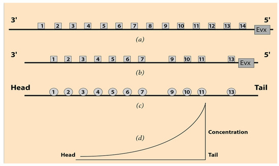 The Even Skipped Gene (Evx) lies close to the centromeric side of the mouse HoxA cluster. It is believed that the tandem duplication of an ancestral ur-Hox gene, followed by several evolutionary modifications, may be the origin of these organized Hox gene arrays [9]. Many other hypotheses have been proposed based on new data on gene duplication and gene ordering [10]. The speculative common ancestor Hox cluster is complete, and the gene ordering is normal from the first Hox1 to the last Hox gene (Figure 1a) [8,9,10]. In vertebrates, there are four paralogue Hox clusters (HoxA, HoxB, HoxC, and HoxD). These paralogue Hox clusters are complementary to each other, and their combinatorial cooperation guides their evolutionary modifications. In each paralogue Hox cluster, some Hox genes are missing as, for example, in the mouse HoxA in Figure 1b. The origin and crucial role of such ‘holes’ in the vertebrate Hox clusters are not well understood (see Section 6).