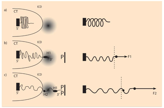 Hox cluster elongation and its mechanical analog (adapted from [17]). (a) (Left) Before activation, the Hox cluster is condensed inside the chromatin territory (CT).The transcription factory region outside CT is shadowed. (Right) Mechanical analog of an uncharged elastic spring fastened at its left end. (b) (Left) The fixed pole P pulls Hox1 (H1) outside the cluster in the intra chromosomal domain (ICD) towards the transcription factory. (Right) A small force F1 expands the spring. (c) (Left) The attracting force of pole P increases (PP), and besides Hox1, Hox2 is also extruded. (Right) The attracting force F2 is stronger than F1, and the spring is further elongated.
