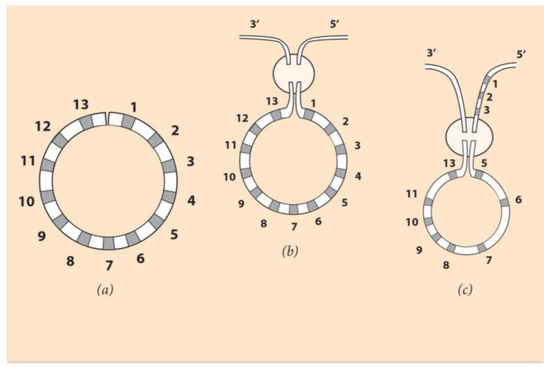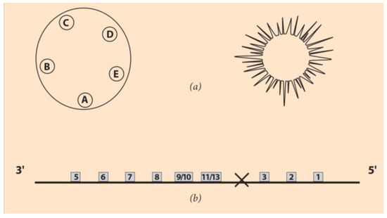 Circular ordering of Hoxgenes. (Adapted from S. Papageorgiou (2016) Current Genomics 17: 444–449) [37]. (a) The linear DNA is bent, and the two ends of the Hox cluster come close together. (b) In the encircled domain, the ends Hox1 and Hox13 of the cluster are connected to the 3’ and 5’ end of the flanking chromosome. If Hox1 is attached to the 3’ end and Hox13 to the 5’ end, the produced linear arrangement is the normal one and could represent the observed A. planci gene ordering. (c) If Hox5 is connected to the 3’ end and Hox13 to Hox3 on the flanking chromosome, the linear ordering is the sea urchin Hox cluster arrangement, as shown in Figure 3.