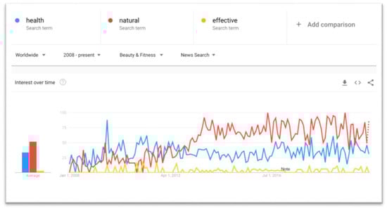 Increasing frequency of internet searches for “health” and “natural” compared to “effective”. Source: keywords searches on Google News in the beauty and fitness category https://trends.google.com/trends/explore?cat=44&date=all_2008&gprop=news&q=health,natural,effective. (Retrieved 1 September 2020).