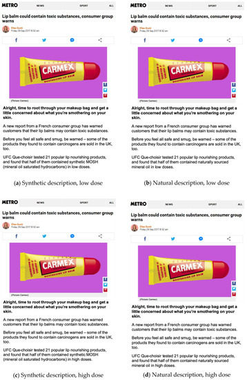 After consenting to participate, respondents were asked to read a slightly edited version of an article in Metro about the safety of lip balms [6]. The four versions were identical except for the last paragraph which stated that half the lip balms contained “synthetic MOSH (mineral oil saturated hydrocarbons)” or “naturally sourced mineral oils” in “low” or “high” doses (see Figure 2).