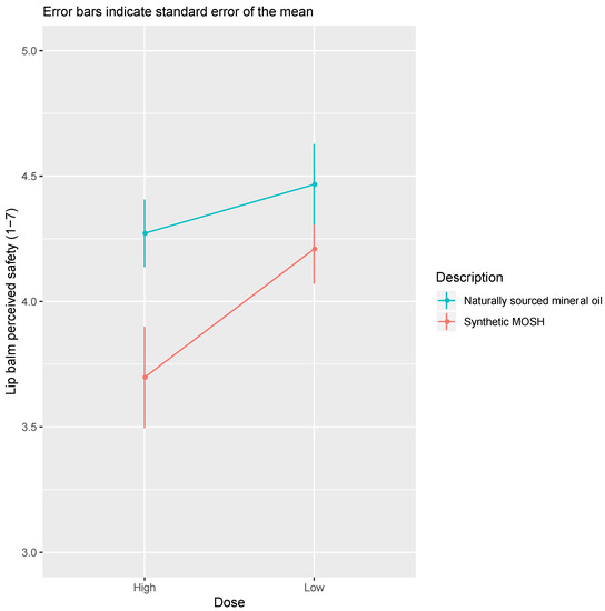 Figure 3 shows that the perceived safety of lip balms was higher when they were described as containing “naturally sourced mineral oil” compared to “synthetic mineral oil saturated hydrocarbons (MOSH)” and when the dose was described as low rather than high. Despite the alarmist title (“Lip balm could contain toxic substances”) and of the first three paragraphs, when the substance was described as being naturally sourced, the average safety perception was always above the midpoint of the 1 to 7 point scale, and thus on the “safe” side of the scale.