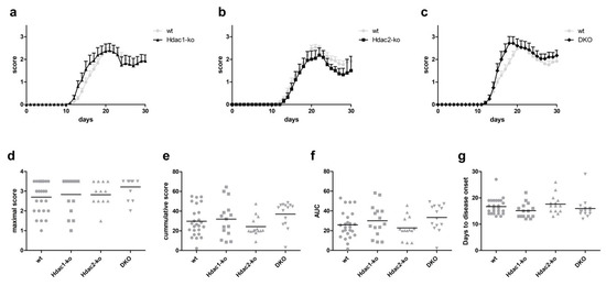EAE disease course in mice with Hdac1 knockout alone was not altered when compared to wildtype mice (Figure 1a). Similarly, the disease course in Hdac2-ko mice appeared unaltered compared to wildtype mice (Figure 1b). As we found previously that double knockout animals showed alterations in microglia functions not apparent in single knockout animals, we also performed EAE in mice harboring a combined knockout of Hdac1 and Hdac2 (DKO) (Figure 1c). While there appeared to be a trend towards a slightly earlier peak of disease, neither the time course nor severity scores of the disease differed significantly from wildtype animals. To investigate disease course and severity in more depth, we also analyzed the maximal scores as well as the cumulative scores and area under the curve (AUC) in all animals (Figure 1d–f). Neither of the strains analyzed showed significant differences in these measurements when compared to wildtype mice. Days to disease onset were also not significantly altered in any of the strains when compared to wildtype controls (Figure 1g).