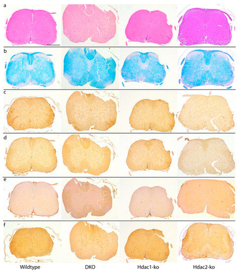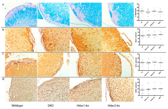 Mice were sacrificed on day 30 after EAE induction and brains and spinal cords were analyzed for histological changes. Spinal cord lesions showed no histological differences between genotypes (Figure 2a). Spinal cord demyelination as measured by Luxol fast blue (LFB) staining was also not altered in Hdac1-ko, Hdac2-ko or DKO mice when compared to wildtype mice (Figure 2b and Figure 3a). Similarly, no overt changes in axonal damage could be found in APP immunohistochemistry (Figure 2f). Macrophage infiltration as well as the number of microglia in EAE lesions were similarly not significantly altered in any of the mouse lines investigated, as evidenced by Mac-3 immunohistochemistry (Figure 2c and Figure 3b). Finally, T-cell infiltration, as visualized by CD3 immunohistochemistry (Figure 2d and Figure 3c), and B-cell infiltrates, as shown by B220 immunohistochemistry (Figure 2e and Figure 3d), exhibited no alteration in the analyzed mouse lines.