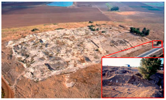 Aerial photograph of Tel Jezreel, evidencing the rectangular shape of the site, which originally had four towers at the four corners. The zoom in the right-bottom inset shows the ruins of one of the four towers (The photographs shown in Figure 1 have been published in D. Ussishkin. 2011 On Biblical Jerusalem, Megiddo, Jezreel and Lachish, Divinity School of Chung Chi College, Chinese University of Hong Kong, Lung‒kwong Lo ed., Hong Kong), https://www.academia.edu/3175337/On_Biblical_Jerusalem_Megiddo_Jezreel_and_Lachish, last access 10 November 2019).