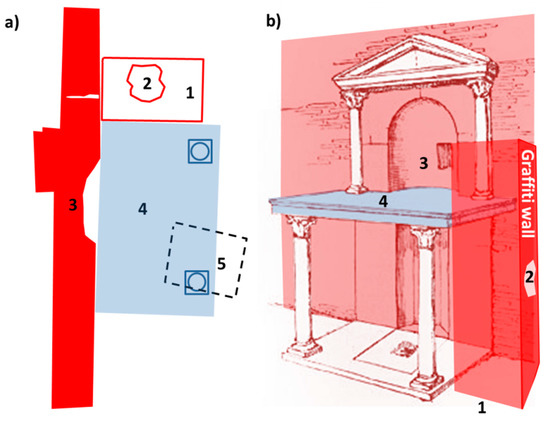 The modest monument was inside a funerary enclosure, called “field P” by the archeologists [12,13]. Field P was full of burial tombs, situated in the bare ground with little or no protection, brought to light during two excavation campaigns in the years 1939–1949 and 1955–1957. The monument was a small aedicule set against the wall of the enclosure, which was covered by red plaster (Red Wall), where two decorative niches, one above the other, extended from the floor, were carved, as to indicate a site particularly important. In Figure 2a, we show a horizontal plan of the site [13], pp. 171; 178 and in Figure 2b a vertical sketch of the aedicule. The niches, given by the curved line in the red wall close to point 3 in Figure 2a (see also Figure 2b), had two little circular columns at the sides, shown as circles inscribed in squares, which held up a slab of travertine (blue rectangle). Some of the tombs in the bare ground are under the little columns. Therefore, some of them can be dated earlier than the Red Wall. Moreover, the niches were included in the Red Wall when it was being built, likely to make a small chapel. It would have been simpler to build it beside the Red Wall instead of indenting it into the wall, therefore indicating, with this effort, the desire of denoting a particular place, considered more sacred than others.