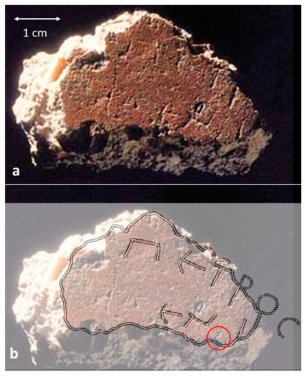 To soften all perplexity, and to prove her discovery, Guarducci declared she had found the proof that they were Peter’s bones in a little fragment of red plaster, found to the right of the niche in the red wall, below the head of “wall g” (Figure 2a), with engraved few letters [13], pp. 172–173. Figure 3 shows a photograph (a) of the little fragment with few letters that supposedly prove the presence of Peter’s remains in the archeological site, and her reconstruction (b) of the full text [21,22], [14], pp. 53–65. She saw the Greek expression “Petr[os] eni”, i.e., “Peter is here”, a kind of proof of his burial, an indirect proof that one of the three skeletons discovered and studied by Correnti, was attributable to Peter. Many epigraphists, however, did not agree with her. In particular, Ferrua proposed “Petr[os] en i[rene]”, i.e., “Peter in peace”, according to the space between some letters, evidenced by the red circle in Figure 3, an acclamation to Peter with the most typical irenical formula of current use since the III century in epigraphic Christian practice [16,18,20].
