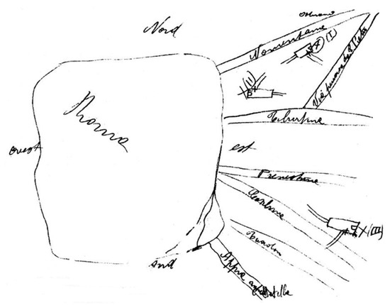 Sketch of the map drawn by Maria Valtorta on 26 August 1948 about three different Peter’s burial sites, referred to the Roman walls [11], p. 14. On the map, she indicates the four Cardinal points and, from North to South: Ostriano, Nomentana, path traveled by Peter, Tiburtina, Prenestina, Casilina, Tuscolana, Appia Antica-Metella.