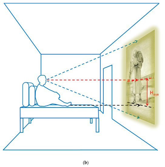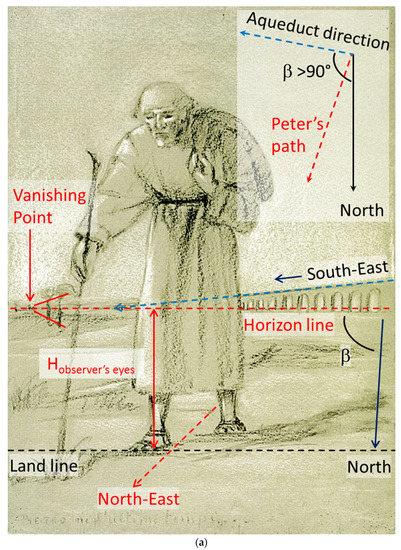 An analysis of the perspective of the drawing allows us to individuate only one vanishing point; therefore, it is not sufficient for calculating Peter’s distance from the aqueduct (two vanishing points are needed). With respect to the direction North-South of the observer of the scene, the aqueduct forms an angle larger than 90°—β in Figure 5a—because its ending part—see the dashed blue line—does not coincide with the vanishing point. Therefore, the aqueduct depicted behind Peter is directed towards South-East, forming a slightly obtuse angle () with the North-South direction. Finally, let us note that the height of the eyes of the observer of the scene—given by the height of the horizon line with respect to the land line—is quite low, at the level of Peter’s knees. This finding implies that Ferri has drawn, and/or Maria Valtorta has described the scene, as seen from below—like looking at an elevated screen—, likely because she was bedridden, as it is sketched in Figure 5b. Indeed, we must always consider that, according to what she writes, all information about Peter’s tomb (Valtorta’s hypothesis), which are under a critical analysis in this work, should be the result of alleged mystical visions. This finding emerges also by the perspective analysis of the L. Ferri’s drawing as sketched in Figure 5b, where Maria Valtorta, bedridden in her small bedroom is depicted while “seeing” Peter walking, as she were in front of a big screen: the height of the eyes of the observer of the scene, , is at the level of Peter’s knees.