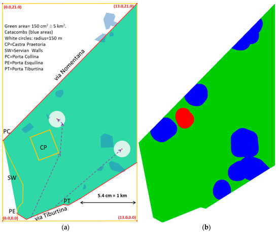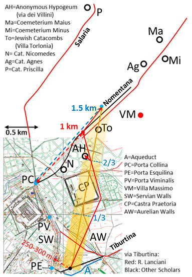 The catacombs shown in Figure 6, close to the two consular roads, are those indicated in Reference [41]. In Figure 6, we have highlighted with a red arrow a possible path that, from Via Tiburtina, near the aqueduct closest to the Servian Walls, would have led to Via Nomentana. The starting point of the path described by Valtorta was located at about m from the Servian Walls, because she writes that the city was few hundred meters far away. From the reconstruction shown in Figure 6, we deduce that, if the rural road starts at few hundred meters from the Servian Walls, near Porta Esquilina, there is an aqueduct—Aqua Iulia—a little further South of Via Tiburtina, indicated with A in Figure 6, and highlighted with the blue color in Lanciani’s map, with the first part just directed towards South-East—as drawn by Ferri under Maria Valtorta’s guidance (see Figure 5a). Thus, imagining to observe the scene of Peter walking along the rural road towards North-East, by looking at the scene from North towards South, we would see the first part of the Aqua Iulia disappearing at the horizon, on the right side of Peter’s shoulders, just as drawn by Ferri (Figure 5a).