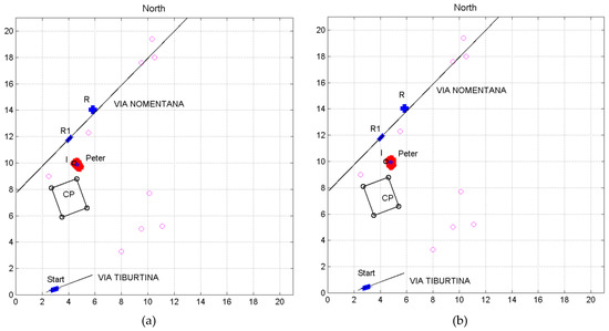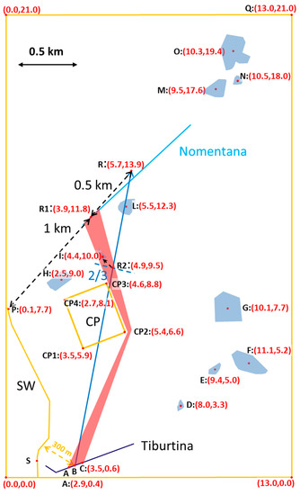 The path of the ancient Via Nomentana (Nomentana Antiqua, I century) is drawn in black to distinguish it from the modern path, shown in red. For the path of the ancient Via Tiburtina exiting from the Servian Walls of the I century, different hypotheses have been formulated [55]. According to some scholars the consular road originally started at Porta Viminalis. For example, Lanciani proposed that Via Tiburtina was first directed South-East, in the region of the city between the Servian and the Aurelian Walls, and then turned to North-East, outwards of the Aurelian Walls, therefore forming a wide curve (red color in Figure 6), and, in this way, he traced the road in his maps [54]. However, today, almost all scholars agree on the conclusion that most likely in the I century Via Tiburtina started at Porta Esquilina, with a fairly straight path, headed towards the future Porta Tiburtina (black color in Figure 6) [55]. On this point, Maria Valtorta writes: «I saw the Tiburtina almost straight (North-East direction) in the immediate vicinity of the city» [11], pp. 25–26. Let us note that Via Tiburtina exiting from Porta Viminalis is directed towards South-East. Consequently, in our analyses, we will refer only to the path of Via Tiburtina starting at Porta Esquilina which, after about 100 m from the city walls is directed just towards North-East (see Figure 6).